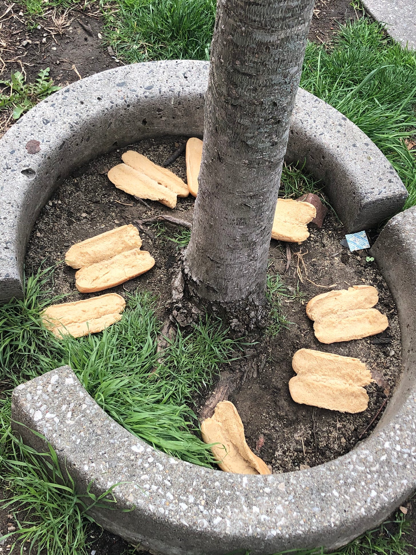 On a walk, and stop to look at various breads carpeting a tree’s rectangular allotment. Stop and others will stop to look too. (I am meant to inspire others to look now)