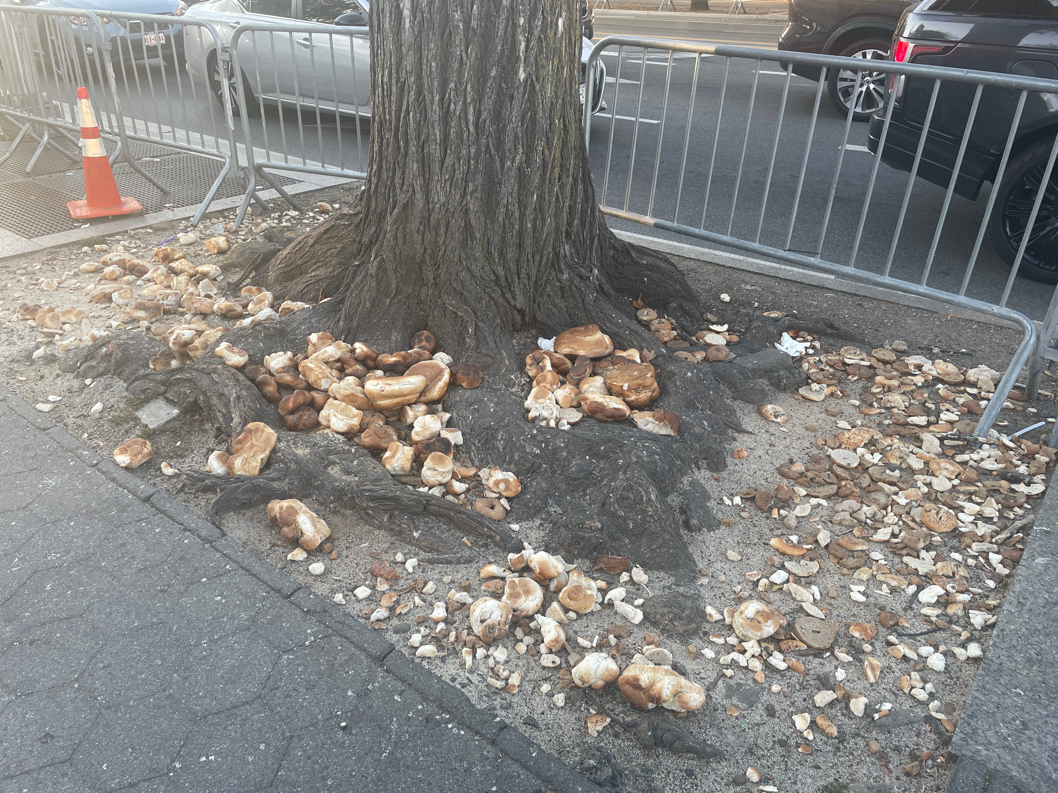 Excess bread along Eastern Parkway I mistook for rocks from far away, during Sukkot festivities.